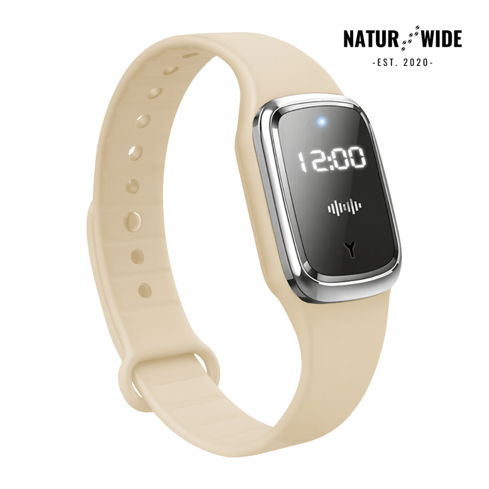 The Mosquito Guard wristband uses ultrasonic waves to scare mosquitoes away. It simulates the natural sounds of male mosquitoes and dragonflies, which biting females find repelling – completely chemical-free.