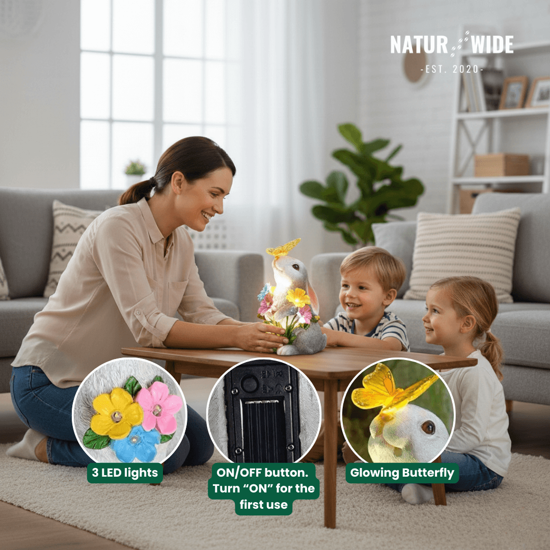 Bring life and light to your garden with our adorable Solar Bunny Statue . This lovingly designed statue is a sweet decoration during the day but unfolds its true magic at nightfall. Depending on the model, the butterfly on the nose shines in colorful hues or the flower glows in a cozy , warm light —without cables or battery changes, purely through the power of the sun.