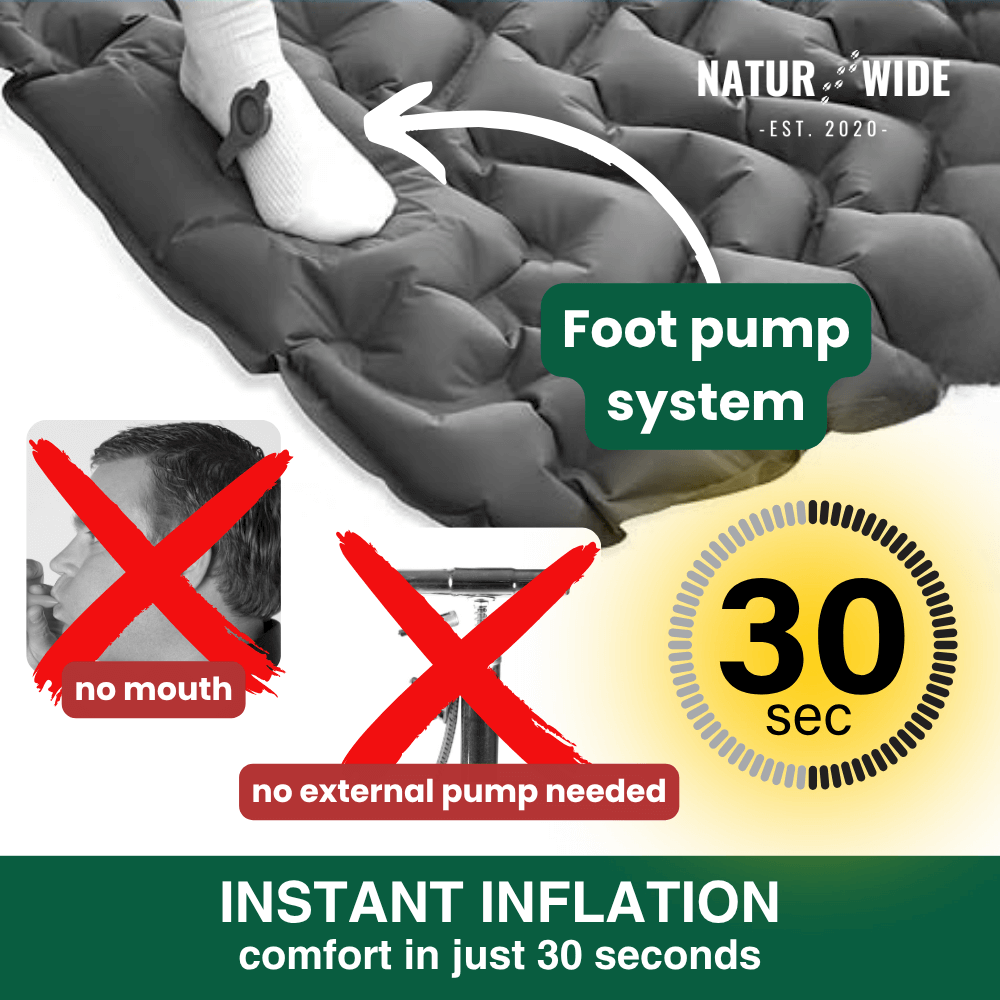 Thanks to the integrated foot pump , the sleeping pad is ready in just 30–60 seconds – no more tiring mouth inflation or bulky external pumps.