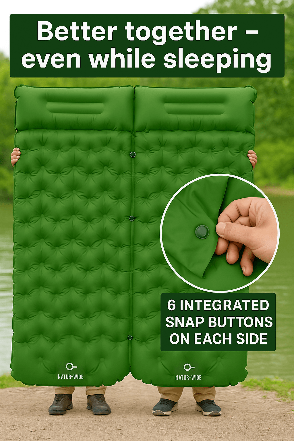 With the integrated snap buttons , you can quickly connect two mats to create a double bed . Secure hold, no slipping – perfect for any adventure for two.